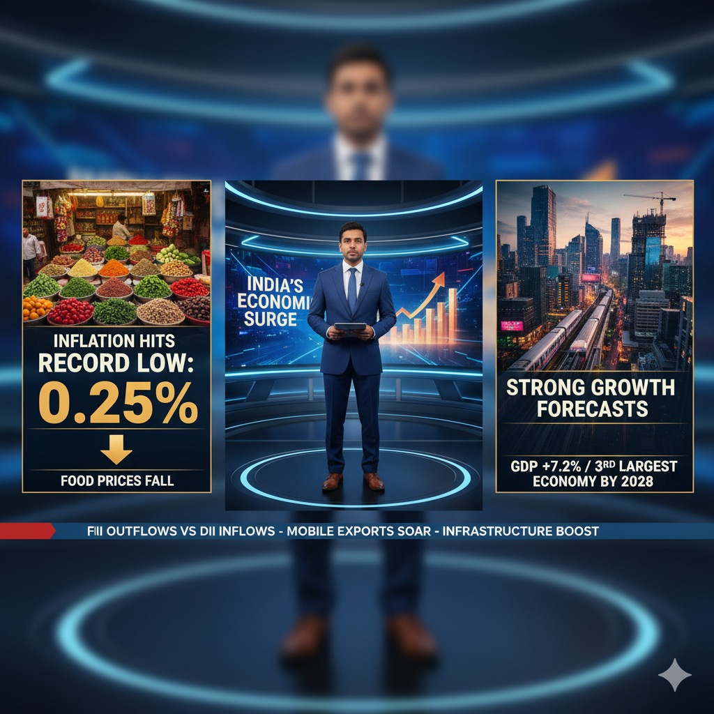 โข Retail Inflation (CPI): India’s retail inflation in October 2025 dropped sharply to a record low of 0.25% ๐ (the lowest since the current series began). This is mainly due to a significant fall in food prices ๐ ๐ง and the positive effect of recent GST rate rationalization.