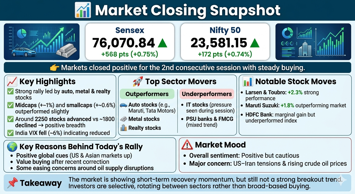 - Sensex: 76,070.84 β² +568 pts (+0.75%)