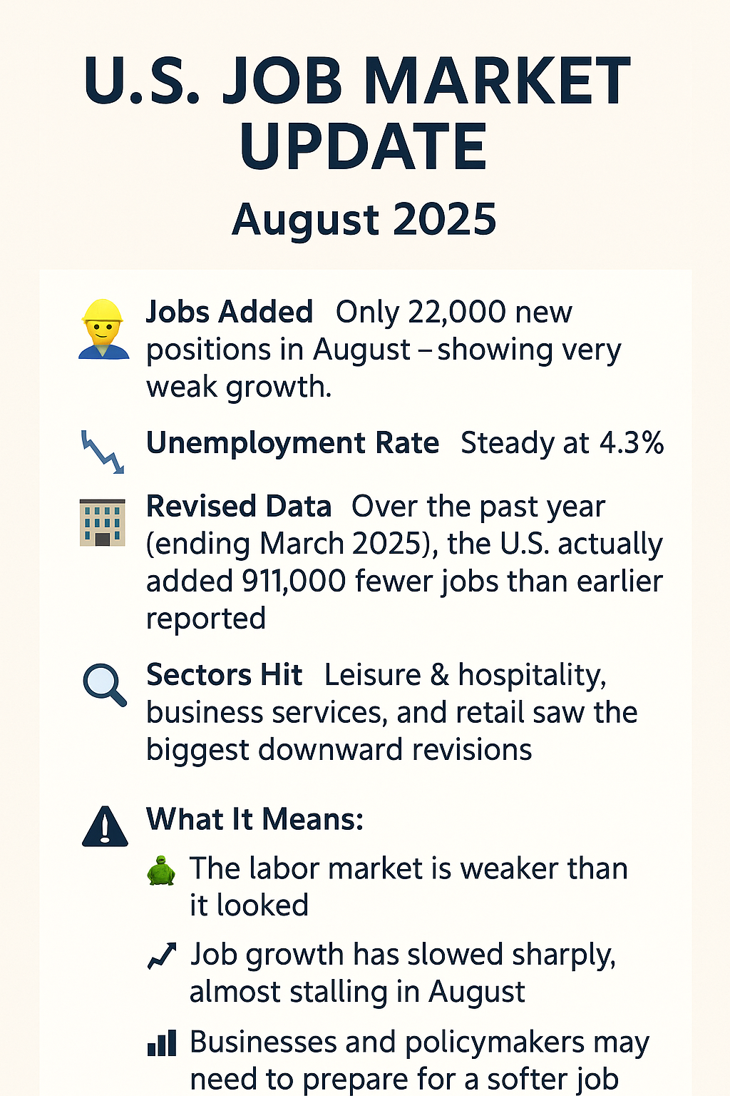 ๐Ÿ‘ทโ€โ™‚๏ธ Jobs Added: Only 22,000 new positions in August โ€“ showing very weak growth.